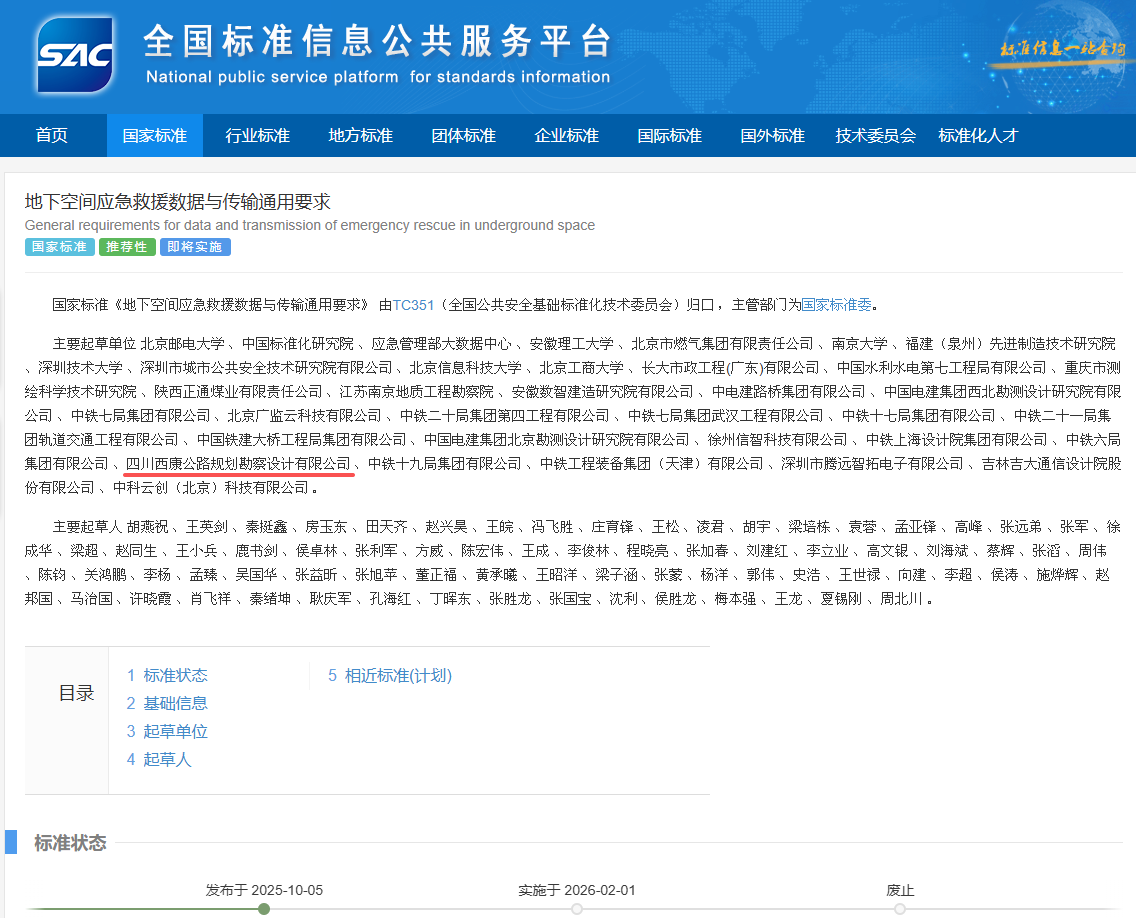 近日,由四川西康公路規(guī)劃勘察設(shè)計有限公司參與編制的推薦性國家標準GB/T 46338-2025《地下空間應(yīng)急救援數(shù)據(jù)與傳輸通用要求》經(jīng)國家標準委批準正式發(fā)布,將于2026年2月1日起正式實施。