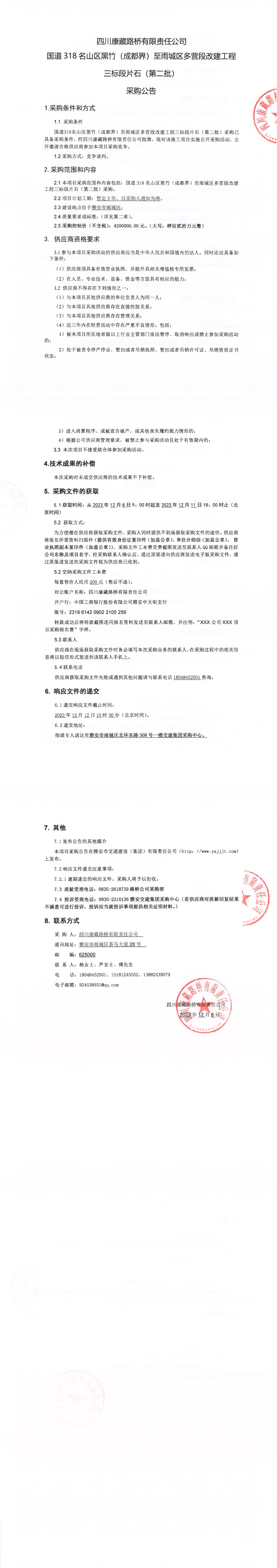 四川康藏路橋有限責(zé)任公司國道318名山區(qū)黑竹(成都界)至雨城區(qū)多營段改建工程三標段片石(第二批)采購公告