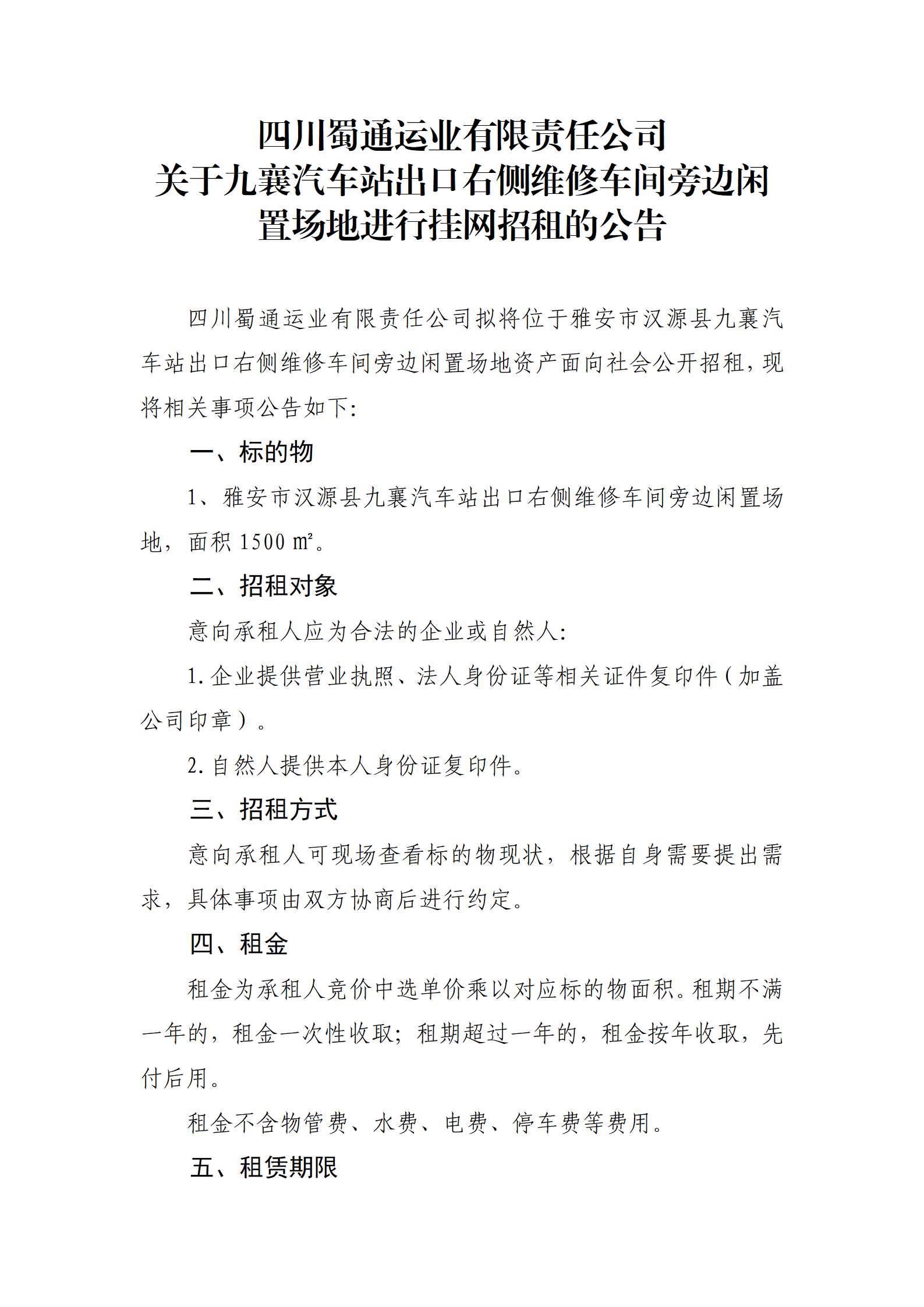 四川蜀通運業(yè)有限責任公司 關于九襄汽車站出口右側維修車間旁邊閑置場地進行掛網(wǎng)招租的公告