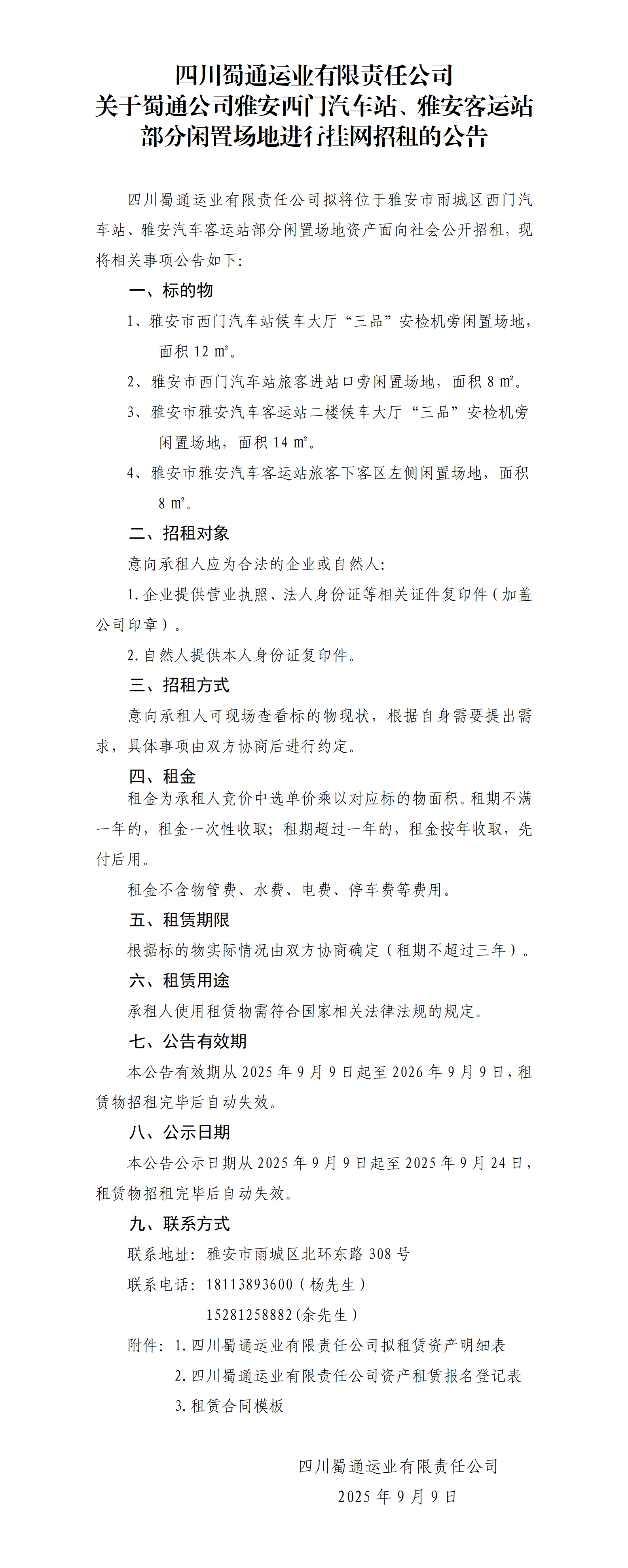 四川蜀通運業(yè)有限責任公司 關于蜀通公司雅安西門汽車站、雅安客運站部分閑置場地進行掛網(wǎng)招租的公告